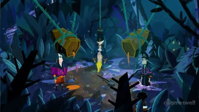 Когда вы доберетесь до пляжа, бегите до конца влево и заберите с собой череп (не говорящий). Чуть дальше вы найдете выход в джунгли. Теперь вы можете ориентироваться по карте с помощью обзорной карты. Сначала держитесь немного правее и посетите затонувший корабль. Это "Морская обезьяна" - корабль, на котором Гайбраш прибыл на этот остров в первой игре. Но это неважно, здесь нужен второй череп, который также следует взять с собой. За кораблем на песке лежит еще одна карта викторины - ее почти не видно, потому что она совсем маленькая.