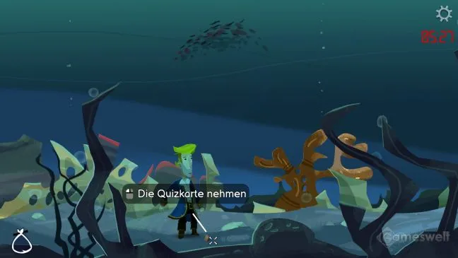На дне моря продолжайте идти направо. Указатель гласит, что прогулка до пляжа займет шесть минут. Так что не торопитесь - это смертельно опасно. Поэтому бегите направо, но не слишком быстро, потому что после первого перехода вы обнаружите застрявшую в морском дне карточку викторины. После следующего затухания вы обнаружите на дне вторую карточку викторины. Возьмите их обе с собой, потому что, оказавшись на суше, вы уже не сможете вернуться в воду.