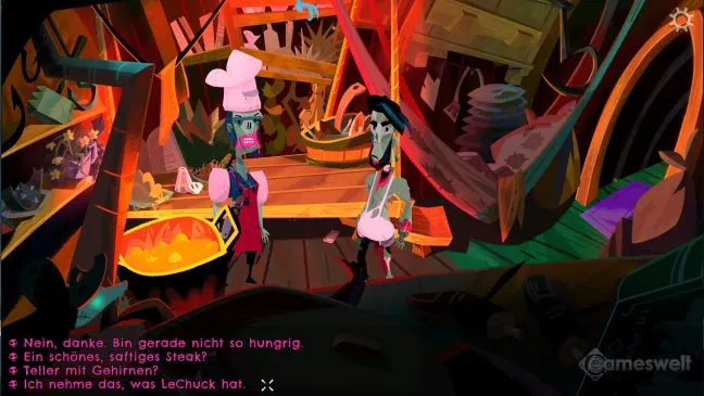 Повар предлагает приготовить вам что-нибудь поесть. Попросите у нее то же, что и у ЛеЧака. Но поскольку большой босс в отъезде, она ничего ему не приготовила. Спросите ее напрямую, что он любит есть. После этого она обвиняет Вас в том, что Вы не интересуетесь ею. Скажите ей, что она - лучший повар (!), которого вы когда-либо знали. Она не ожидает, что ее назовут поваром. Вы поймали ее на этом. Снова спросите о любимом блюде ЛеЧака. Она говорит, что это щупальца с соусом из маргариток. Если вы следовали нашему решению, то у вас уже есть с собой кусочек щупальца. Если нет, вернитесь на пляж и отрежьте ножом кусок от лежащего там мертвого кальмара. Достаньте щупальце из инвентаря и отдайте его Путре, чтобы она приготовила любимое блюдо ЛеЧака. Заберите готовое блюдо с собой и покиньте камбуз.