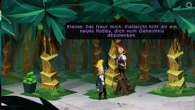 На следующей карте острова Scurvy Island сначала нужно пройти на крайний северо-восток к красной палатке (к лагерю). Там на столе вы найдете записку, в которой говорится, где находится Элейн.