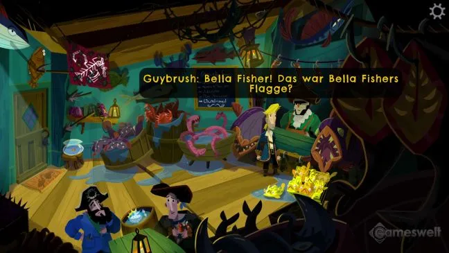 Свою первую рыбу-удильщика вы найдете в баре Scumm. Его можно узнать по тому, что на его шляпе висит такая же приманка для рыбы. Достаньте приманку из инвентаря и используйте ее на пирате. Затем вас попросят рассказать историю.