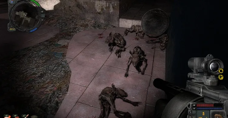 Используйте лестницу (1) и пройдите в нижнюю часть лаборатории. Перепрыгните химическую аномалию в красной точке. Перед вами затопленная комната в середине зала. Вы найдете документы на одном из столов, рядом с компьютером. После этого на вас снова нападут собаки.