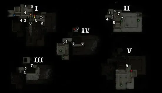 Используйте лестницу в красной точке. Вам придется сражаться с двумя снорками в черной точке. Используйте лестницу в (9) и войдите в комнату слева. Откройте дверь в красной точке и убейте бюрера. Возьмите последний комплект документов, как только вы вернетесь к (0), вам придется столкнуться с контролирующим сознание мутантом, так что не смотрите ему в глаза.