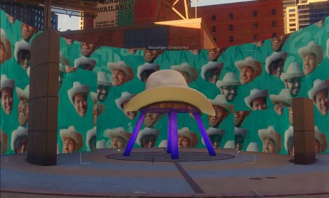 Эта гигантская ковбойская шляпа находится в районе North Lakeshore, на самом западном краю района. Следуйте по центральной дороге, проходящей через район North Lakeshore с востока на запад, до самой западной точки. К югу от вашей позиции находится реклама этой шляпы и коллекционный предмет большого размера. Всего в нескольких метрах к югу находится коллекционный предмет "Силуэт костра".