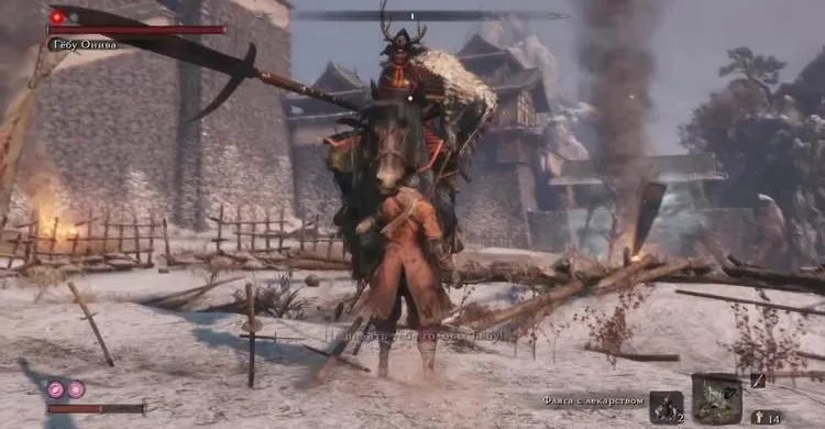 Босс: Гёбу Онива. Поскольку двери закрыты, перебираемся через забор слева и попадаем на большую арену. Видим множество убитых воинов. Перед нами появляется всадник с огромным копьём, это и есть босс. От его ударов невозможно уклониться, поэтому лучше их блокировать. Когда он отбегает, мы можем притянуться к нему крюком, застанив его. Выигрываем немного времени и наносим удары. Если блокировать атаки, часто притягиваться и оглушать, всадника довольно просто убить. К тому же можно использовать петарды, чтобы напугать его лошадь. После убийства босса мы получаем его воспоминание (если активировать его рядом с идолом, навсегда увеличим силу своей атаки), а также очередное улучшение протеза — Механический ствол.