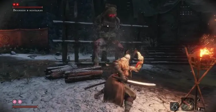Босс: Великан в колодках. Рядом с забором прикован монстр. Если приблизиться к нему он высвободится из оков и будет нападать. Если великан поймает нас, то сможет убить, ударив о землю. Поэтому необходимо избегать его захваты и убегать от его нападений. Сражаться лучше в ближнем бою. Чтобы бой прошел легче и быстрее, можно заранее пройти локацию «Поместье Хирата» и активировать огненное оружие.