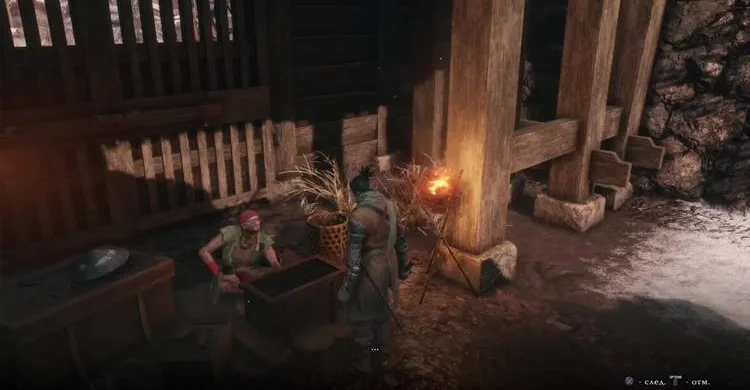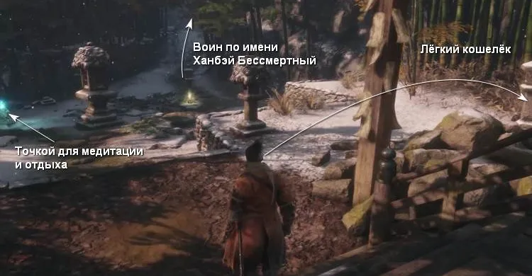 Мастер также рассказывает об идоле резчика, для нас это будет точкой для медитации и отдыха. Рядом со зданием можем найти Лёгкий кошелёк. На территории лагеря стоит воин по имени Ханбэй Бессмертный. Когда мы сразимся с ним и победим, он снова встанет. Этот бессмертный воин необходим обучения отработки навыка боевых искусств. Мы всегда можем возвратиться к нему, чтобы сразиться снова. Слева от воина стоит Ящик для подношений, в нем будут появляться потерянные предметы. Если ящик подсвечен, значит появилась возможность забрать предмет, но только после пожертвования.