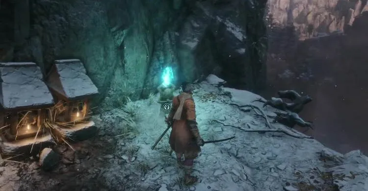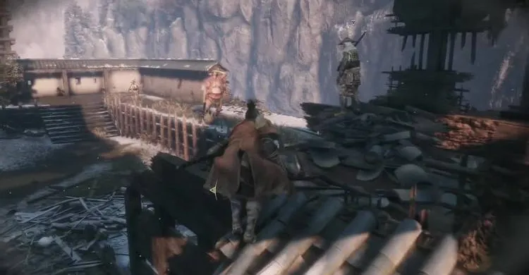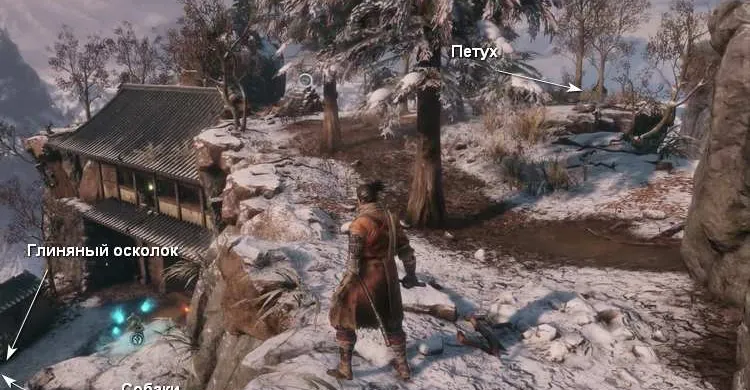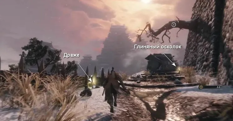 Слева от места боя есть скала, поднимаемся на нее и спрыгиваем на утёс, при этом мы можем потерять несколько единиц здоровья. Внутри пещеры находим Статуэтку Дзидзо. Она восстанавливает одну единицу воскрешения. Выходим из пещеры и прыгаем на дерево справа. Среди кустов спрятан очень полезный предмет под названием Леденец Гатиина (скрывает присутствие героя). Забираемся по скалам, притягиваясь к дереву с помощью крюка. Впереди можно увидеть воина с пушкой. Незаметно подкрадываемся сзади и убиваем. После убийства получаем Черный порох, необходимый для протеза и Порошок противоядие. Внизу находится Драже.