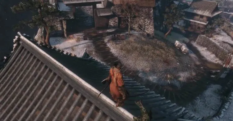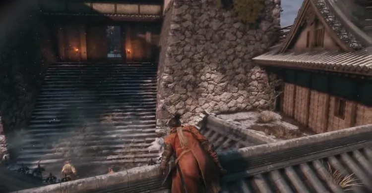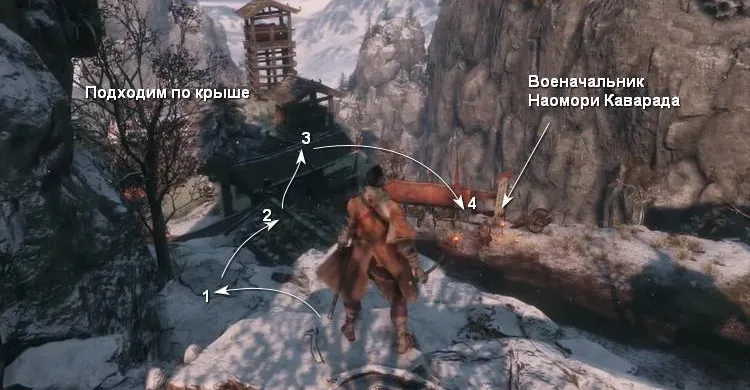 Мини-босс: Военачальник Наомори Каварада. Это лёгкий бой, для победы требуется нанести всего два сильных удара. Незаметно подходим ближе к нему по крыше и наносим скрытный удар. Воин обладает способностью наносить круговые удары. Они достаточно сильные, поэтому необходимо избегать их. Также он может схватить нас и ударить о землю. Победив военачальника, мы получим одну Бусину от чёток (4 таких предмета увеличивают концентрацию и максимальное здоровье) и Семечко тыквы (если отнести его целительнице Эмме, увеличится количество применений фляги). Рядом с воротами можно найти Пригоршню пепла.