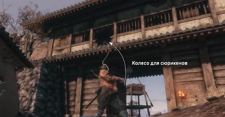 Возвращаемся к воротам и проходим через них, видим двухэтажное здание. Чтобы попасть внутрь здания, необходимо забраться на крышу и пролезть через дыру в ней. Там находим Колесо для сюрикенов. Этот предмет улучшит наш протез и его надо отнести мастеру. Поэтому идём обратно к ближайшему идолу Резчика и телепортируемся. Показываем находку мастеру, чтобы он установил улучшение. Теперь мы способны метать сюрикены (клавиша Ctrl). Также у входа в храм появилась девушка, её зовут Эмма и она обучена умеет исцелять. Если мы дадим ей тыквенные семечки, она увеличит количество использований нашей фляги. Больше никаких изменений в храме нет, поэтому возвращаемся в локацию.