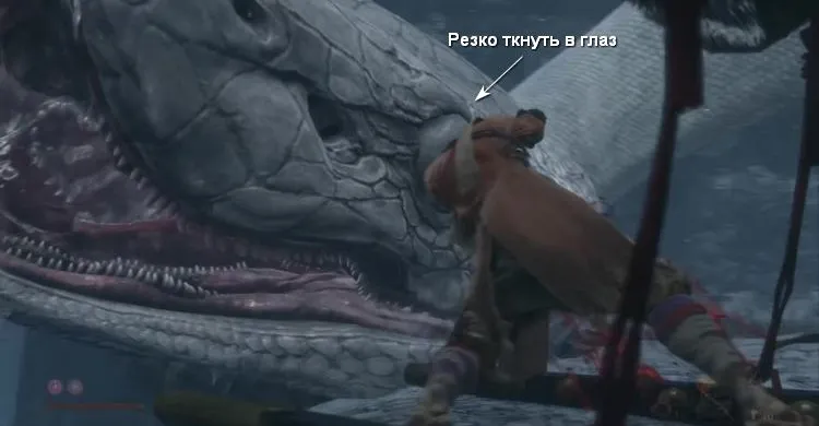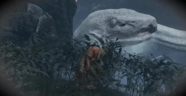 Идём вниз по скале. Необходимо зацепиться за дерево впереди, чтобы не упасть в бездну и не потерять здоровье. Также цепляемся за следующее дерево, прыгаем на утёс и быстро скрываемся в кустах. Локация начинает дрожать, появляется гигантский белый змей.