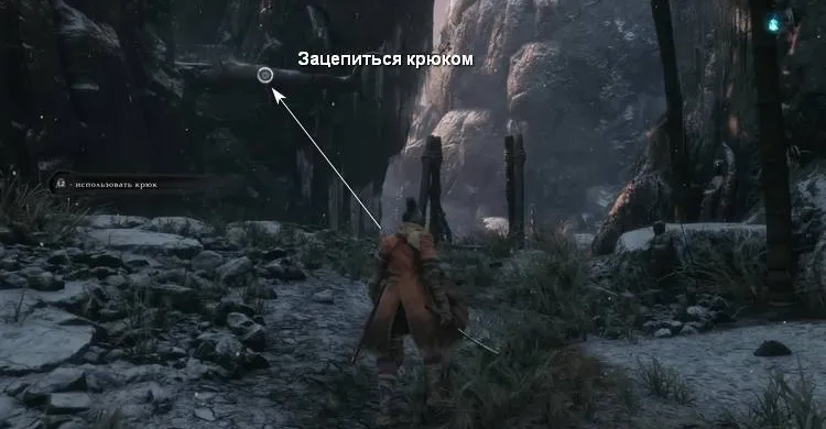Рядом с лагерем есть разрушенный мост, с помощью крюка из протеза (клавиша F) мы можем зацепиться за него. Целиться можно с любого расстояния, но зацепиться возможно, когда цель окрасится в зеленый цвет. Подходим ближе к дереву, прыгаем и выпускаем крюк. Поднимаемся и идем к обрыву. Нам необходимо попасть к идолу резчика и сохраниться. В будущем мы можем не только отдыхать рядом с идолом, но и перемещаться между локациями.