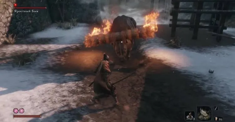 Босс: Яростный Бык. Во дворе нас ждёт огромное животное с горящими факелами. Он много бегает и пытается подкопать нас, нанося огромный урон. В такие моменты его опасно бить. Ждём, пока он будет разворачиваться и притормаживать, чтобы ударить его по задним копытам. После этого он перестанет бегать на время и будет мотать мордой. Нам необходимо уворачиваться и бить сзади, пока не победим. Также можно использовать петарды, поскольку босс является животным. Нашей наградой за победу будет Бусина от чёток и Лекарство Синоби второго уровня.