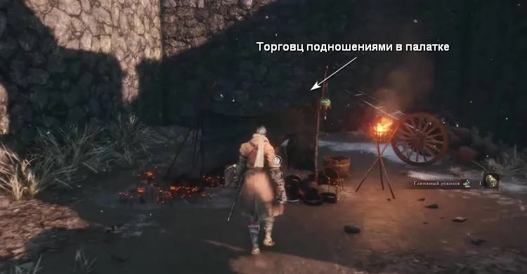 Если подняться по лестнице справа от арены, найдём Глиняный осколок и увидим торговца подношениями в палатке. Из интересных предметов, у него есть Петарды Роберта и Семечко тыквы.