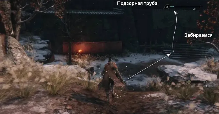 После смерти великана выпадут две Бусины от чёток и откроется «Лекарство синоби». Забираемся на двухэтажное сооружение и пробираемся внутрь сквозь дыру. Находим подзорную трубу и два тыквенных семечка.