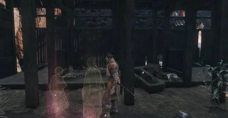 Находим торговца с красной повязкой, который сидит около дома. Анаяма продаст нам интересную информацию за 50 сэн. Он расскажет, что раньше был вором и как вломился в поместье Хирата. В ту ночь он увидел нашего героя, который что-то искал. Следующая покупка обойдётся уже в 100 сэн. Воспоминания не столь важны, но если сразу не заплатить, то затем возможность исчезнет. Информация будет об огненном стволе, который является еще одной модификацией протеза. Слева от торговца стоят приведения Куро и Эммы воспроизводящих воспоминания об их разговоре.