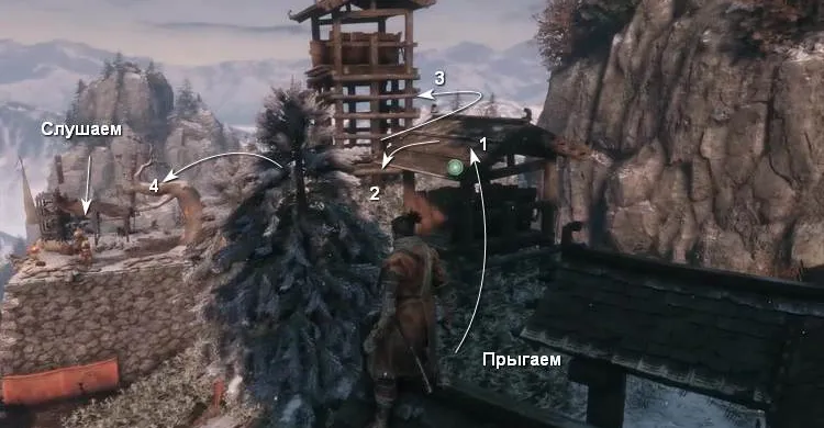 Если подняться выше, увидим одного воина, стоящего рядом с воротами. Подбираемся к нему сзади, для этого перепрыгиваем на возвышенность и цепляемся за дерево. Бесшумно устраняем воина и еще несколько врагов.
