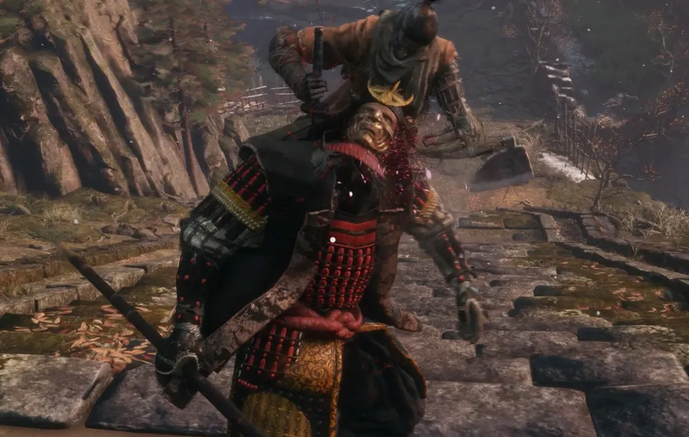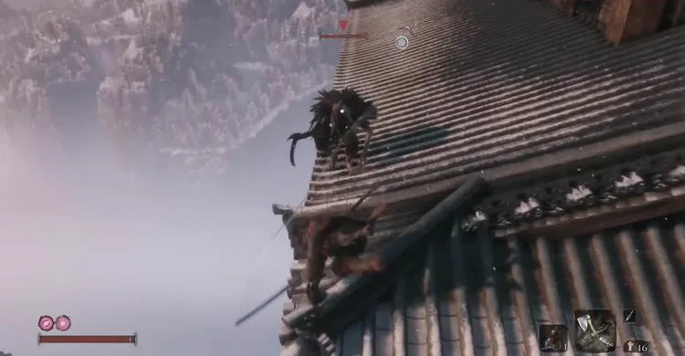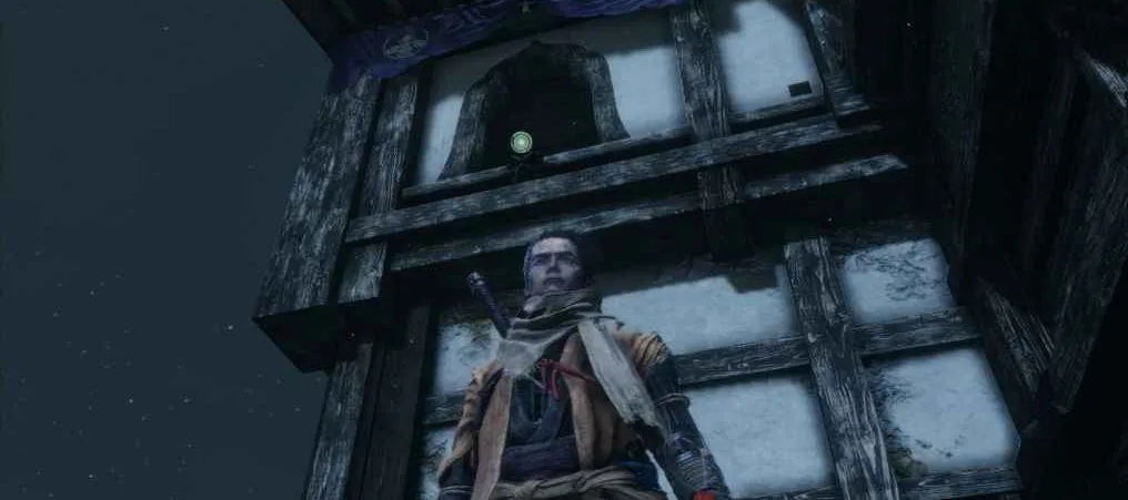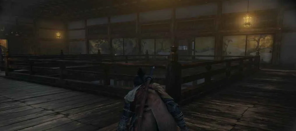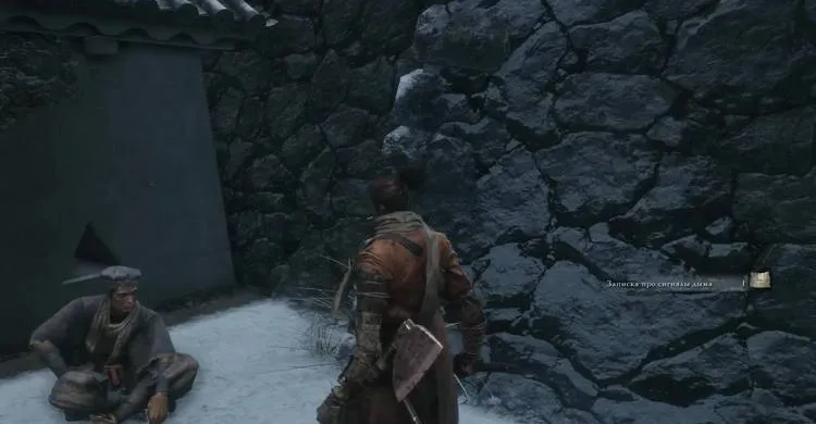 Спускаемся по лестнице и убиваем солдат и двух толстых самураев (подождать, пока один отвернется и убить сзади). Теперь нам надо попасть в дом, под которым ползали в начале игры. Открываем двери ключом от караулки. Внутри дома лежит Тяжелый кошелек, а в сундуке находим Сломанный рог Гёбу (крестообразное копьё для улучшения протеза). Под домом спрятан Глиняный осколок. Лучше всего пройти под домом и затем по утёсам и скалам добраться до дома напротив.