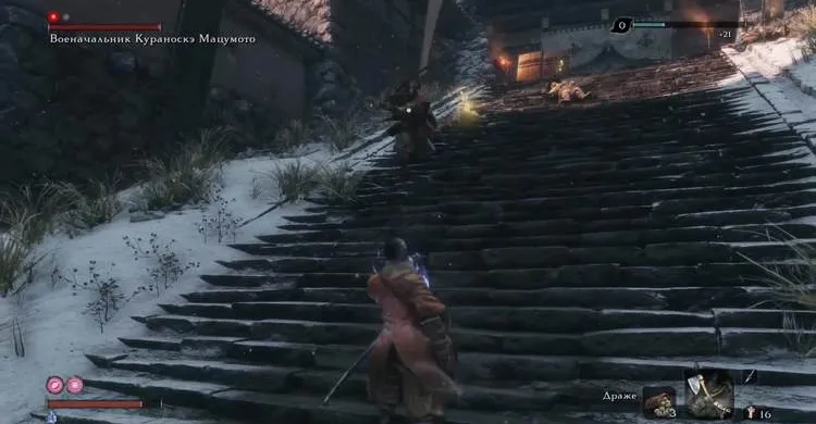Мини-босс: Военачальник Кураноскэ Мацумото. У босса 2 жизни, но он достаточно легкий. Надо лишь отражать его атаки по возможности и нападать в ответ. После победы получаем Бусину. Также у ворот, которые охраняли солдаты, стоит сундук с Божественной травой (полностью восстанавливает запас жизни и снимает отрицательные эффекты)