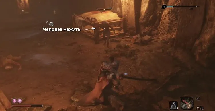 В пещере, где проходил бой мы сможем найти Магнетит, Шар воскрешения и черный порох. Если зацепиться за уступ (за бонусами) и подняться, то сможем найти идол для сохранения. На этой же возвышенности лежит Большой кошелек. Идём в тоннель и увидим еще один идол Резчика. Потом нам встретится старая женщина, направляющая нас в пропасть (новая локация). Но мы пока не прыгаем туда и идём обратно к идолу.