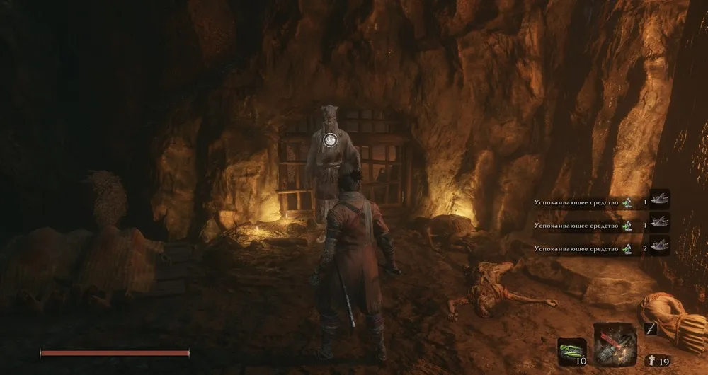 Направляемся в проход справа от идола. Спускаемся по лестнице и попадаем в пещеру, освещенную огненными факелами. С правой стороны будет небольшой лаз. Присев и пройдя по нему попадём в маленькую комнату с Успокаивающим средством. На основном пути нас будет ждать нежить, некоторых можно убить с одного удара, а у некоторых две жизни. Второй тип больше похож на человека.