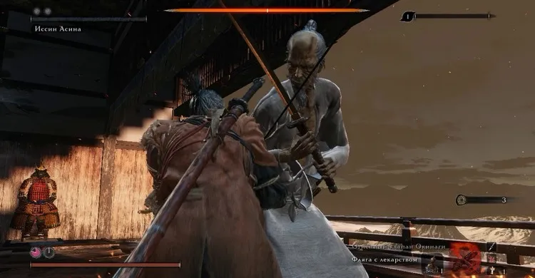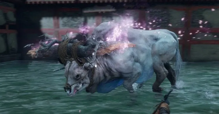 Мини-босс: Пурпурный бык Сакуры. Перед нами мост, но мы пока что не пойдем туда. Вместо этого разворачиваемся и обходим ворота с правой стороны. Немного проходим вперед и найдём зацеп на крыше. Поднимаемся, убиваем врагов сверху. В одном из дворов увидим большого быка с горящим деревом на рогах. Мы встречали подобного в стенах замка Асина. Стараемся парировать атаки и ударить со спины. За победу получим Бусину и пассивный навык «Карма зверя».