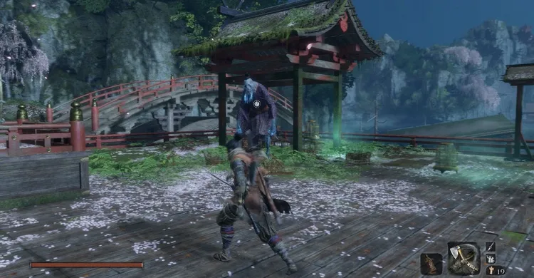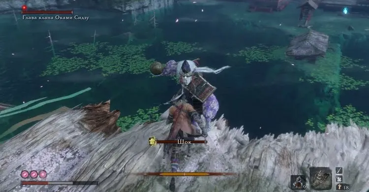 Мини-босс: Глава клана Оками Сидзу. Рядом с площадкой, где получили сакэ растёт огромное дерево. Прыгаем на него. Мы увидим босса, которая метала в нас молнии, пока мы находились в воде. Помимо этих молний, она также владеет мячом. Быстро добегаем до нее и убиваем, потому что вблизи она неопасна. Получаем Бусину от четок.