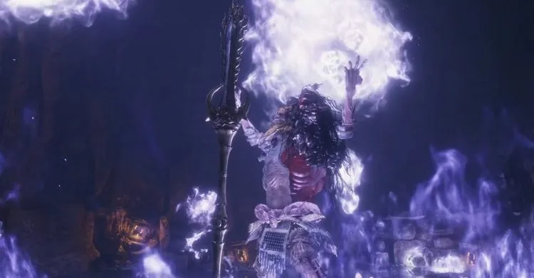 Босс: Иссин, мастер меча. Неприятный бой, который можно облегчить зонтом. Во второй фазе он достаёт копьё и может стрелять. От крутилки спасаемся пером или зонтом, если тяжело понять тайминг. В третьей фазе появляется атака молниями, которую можно отразить в него. Таким образом он сам себе нанесет очень много урона и оглушит. Закончить бой надо ударом красного клинка, и разрубить узы бессмертия. После победы получим Воспоминание о мастере Иссине и навык «Дыхание дракона».