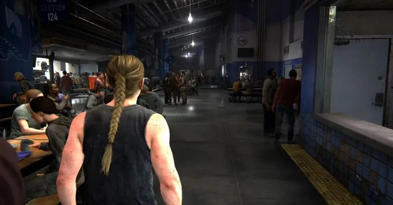 Следуйте за Мэнни по коридорам футбольного стадиона, который служит базой WLF. Здесь вы познакомитесь с друзьями Эбби. Побродите по импровизированному кафетерию и поговорите с каждым, у кого есть символ треугольника, указывающий на то, что к нему можно подойти, и получите бурито на обед в очереди в продовольственный банк. Мэнни позаботится о том, чтобы вам не пришлось долго ждать в очереди.