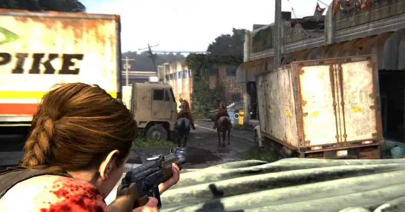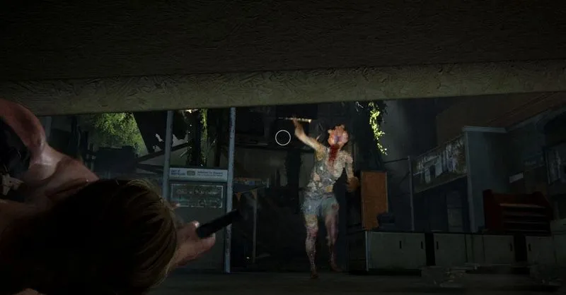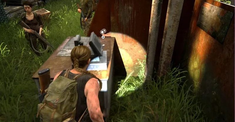 В какой-то момент на вас нападут несколько зараженных. Никакой большой драмы, вас четверо (с собакой). Когда вы закончите с ними, игра укажет вам на место, которое нужно осмотреть (нажмите L3). Эбби найдет несколько полок, на которые можно забраться – возможный выход находится неподалеку.