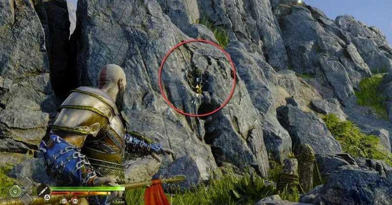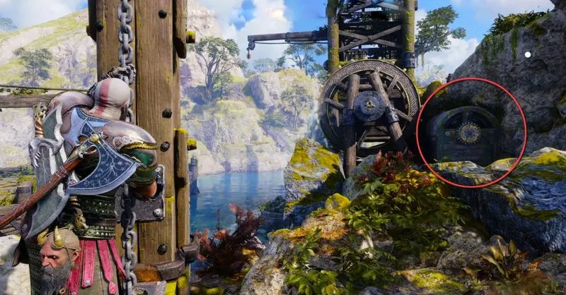Перекатитесь обратно на деревянную платформу, перейдите на ее восточную сторону. Бросьте топор в гейзер перед водяным колесом, чтобы заморозить его и остановить водяное колесо. Лифт спустится вниз. Заскочите на подъемник и отзовите свой топор, чтобы заставить его подняться вверх. Поднимитесь по скалам и найдите легендарный сундук с Фольквангрским камнем. Веревка, которую вы развяжете, позволит вам скатиться обратно на пляж.