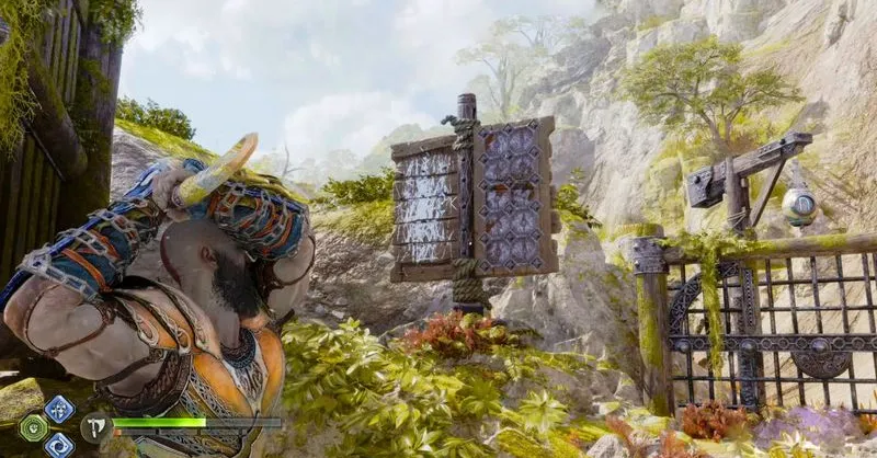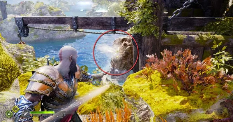 Сначала развернитесь и копьем разбейте громоздкий валун перед вами (на нем есть желтая трещина). Теперь пробегите немного на юг и загляните в отверстие в скале. Там сидит один из воронов Одина. Убейте его, прежде чем продолжить путь и добраться до цепи, с помощью которой можно опустить барьер перед водяным колесом. Чтобы его опустить, заморозьте механизм справа (который можно увидеть, только взорвав скалу) и используйте сигил, чтобы сохранить его замороженным.