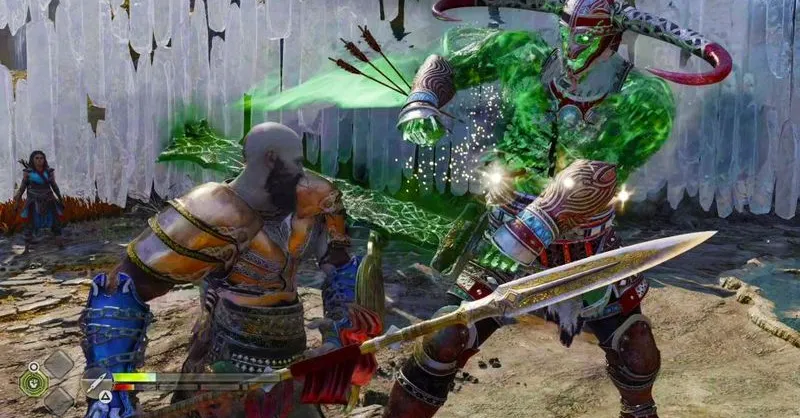 Если он крикнет при мне «падай», он набросится на вас с прыжком. Слишком раннее уклонение не поможет, так как он может корректировать направление падения во время прыжка. Вы должны откатиться в самый последний момент (дважды нажмите кнопку X), прежде чем он упадет на землю. После этого он некоторое время неподвижен и поэтому уязвим. Если вы все сделаете правильно, то сможете пять или шесть раз подряд ударить его копьем в спину. Вы должны научиться выбирать время.