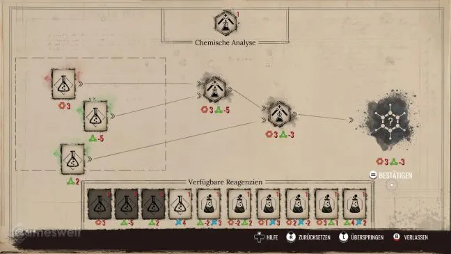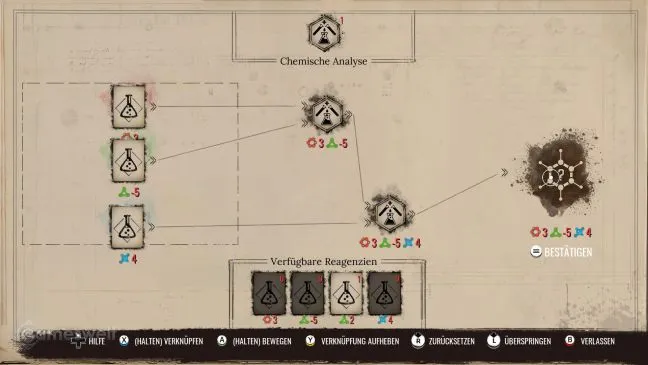Наконечник стрелы содержит неизвестное вещество, требующее химического анализа. Запустите химический анализ отравленного дротика через папку case. Настройка показана на нашем скриншоте. Вам нужны красный3 , зеленый-5 и зеленый2 с левой стороны. Поместите два химических анализа в центре. Подключите red3 и green-5 к первому анализу, а green2 - ко второму. Соедините первый анализ со вторым, а затем соедините второй анализ с конечным результатом.