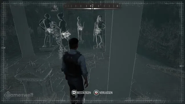 Активируйте их, чтобы мысленно разобраться с расположением четырех статуй. Правильное расположение см. на нашем скриншоте. Когда вы стоите у каменной плиты, человек с головой льва должен находиться на правом цоколе, лицом к Шерлоку (она обращена на юг). Статуя с мечом и щитом находится на левом цоколе спиной к Шерлоку (она обращена на север). Статуя с виноградной лозой в руке стоит на ближайшем к каменной плите цоколе и обращена влево (на запад). Статуя с полумесяцем стоит на самом дальнем цоколе и смотрит направо (т.е. на восток).