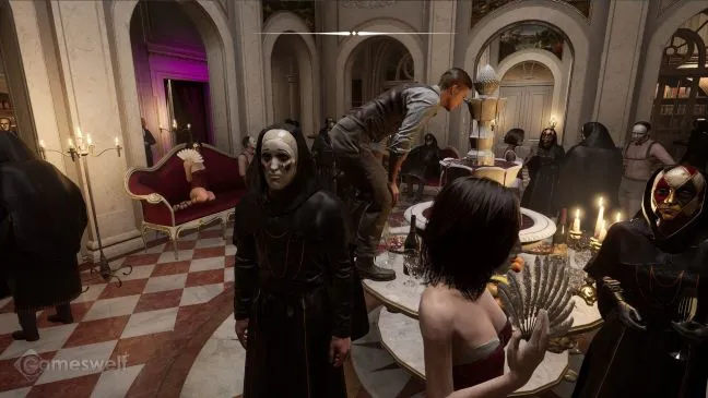 Собрав маску для бала в старом особняке, вы можете отправиться в особняк господина Манчио (он находится в Бирюзовом переулке, напротив аббатства Кордона на севере Гранд-Сарая). Оденьтесь в новый наряд (Князя Тьмы), включая маску, чтобы получить разрешение на вход. Войдите через главный вход и двигайтесь по вечеринке. Здесь довольно скользко. Пробираясь по коридорам, выйдите в коридор, освещенный неоново-розовым светом. В коридоре пройдите за угол через красные шторы, чтобы встретить Вернера Фогеля.