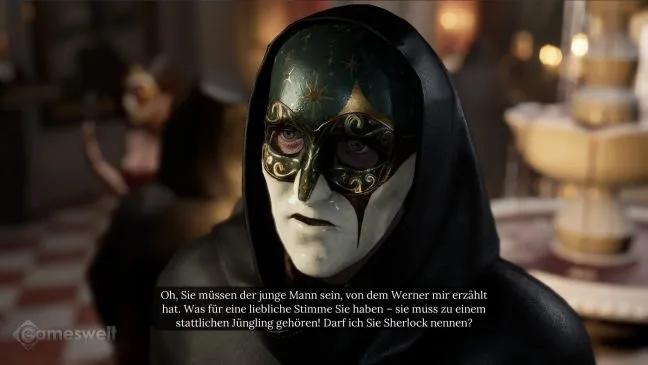 Поговорите с Вернером Фогелем и предъявите ему имеющиеся у Вас доказательства. В результате вы узнаете, что хозяин выдал еще несколько ключей. Он находится в главной комнате у фонтана и носит маску с золотыми звездами. Задайте ему вопрос.