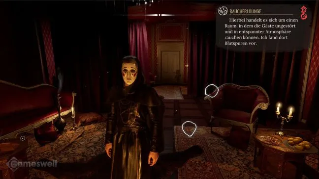 Вернитесь в зал для курения. Приблизьте зал для курения, чтобы появились новые пузырьки мыслей, и пройдите через них. Вы обнаружите еще три кровавых следа, ведущих из комнаты. Теперь вы можете собрать пузырь реконструкции в трех комнатах. Вам понадобятся: