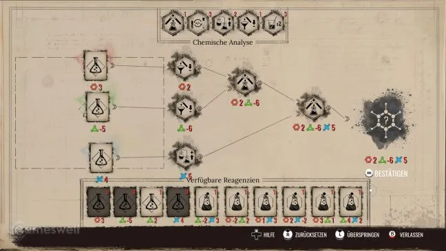 Когда Вы войдете на склад, начнется бой. Защищайтесь от бандитов и (как всегда) старайтесь убить как можно меньше. В результате Вы получите ключ от офиса склада. Найти офис можно по лестнице за решеткой (она немного похожа на тюремную дверь). Осмотрите стол в офисе склада (письмо от Б., шерсть, записка с пятнами грязи). Также осмотрите отопительную печь (сгоревшие документы в огне, обгоревшая бумага на полу). Вы также найдете коробку со стреляющим железом. Теперь вы обыскали все. Следующий шаг - химический анализ пожелтевшей бумаги. Вот как происходит анализ: вам нужно красный+2зеленый-6синий5 , и вы получили новый инструмент: Двукратный множитель. - возьмите красный+3 и уменьшите его на одно значение с помощью вычитания - возьмите зеленый-5 и уменьшите его до зеленого-6 с помощью вычитания - возьмите синий+4 и добавьте значение с помощью инструмента сложения Вы складываете эти элементы вместе, как обычно, с помощью двух инструментов слияния, и смесь готова. Точный способ можно увидеть на нашем рисунке.