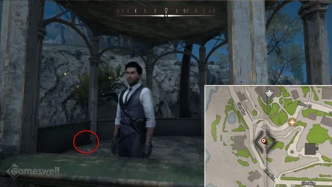 От поместья Стоунвуд идите на запад по извилистой дороге, пока не подниметесь по лестнице справа. Вы найдете павильон, под которым находится ящик с сокровищами.