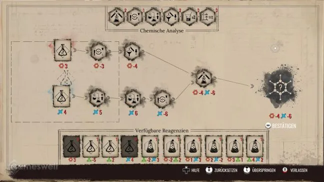 Пора провести химический анализ найденного трупа. Вам нужна простая комбинация красный-4синий-6, и в вашем распоряжении все операторы. - Возьмите красный+3, измените его на красный-3 и вычтите одно значение, чтобы получить красный-4 - возьмите синий+4, увеличьте значение на один пункт в два раза, чтобы получить синий+6, и измените значение на противоположное. Наконец, необходимо соединить элементы. На нашем рисунке вы можете увидеть, как должен выглядеть анализ.