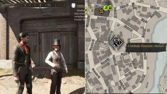 Ваша булавка "Удивительная синхронность" получила обновление. Сделайте булавку и спросите Леди Теленок, есть ли у нее садовник. Она ответит отрицательно. Теперь вы нашли все подсказки в этой локации. Вы получите новую булавку "Серия подсказок". Это требует поиска из-за костюма садовника и явной ссылки на Miner's End. Но где же искать? Ну, оставленные преступником игральные карты указывают на год - туз, восьмерка, семерка, восьмерка. Значит, это 1878 год, что исключает полицейский участок, так как там нельзя посмотреть годы. Первое подозрение - архив газет, но там ничего нет. Решение находится в архиве мэрии! Используйте следующие критерии поиска: Метка: Серия подсказок Группы людей: Бизнес Период: Британия (19 век) Районы: Miner's End В результате поиска был найден магазин костюмов под названием Gimbals Costume Atelier. Он был открыт в 1878 г. и в том же году обанкротился. С тех пор здание было заброшено. Оно находится на Медной улице, между Лестрейд-роуд и Фурриер-стрит в районе Минерс-Энд. Вот куда вы хотите отправиться! Пункт быстрого перемещения "Рынок Майнерс-Энд" находится неподалеку. Вход в нужное вам здание находится на углу с улицей Фуррер.