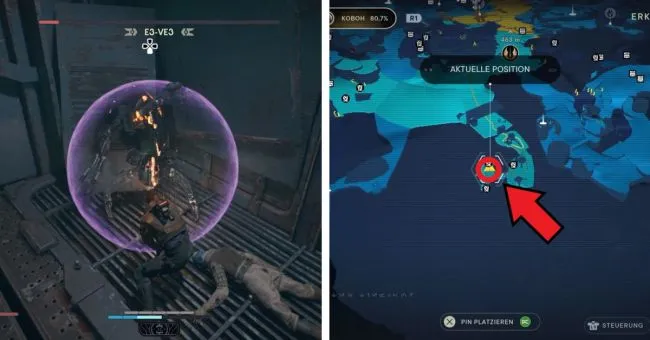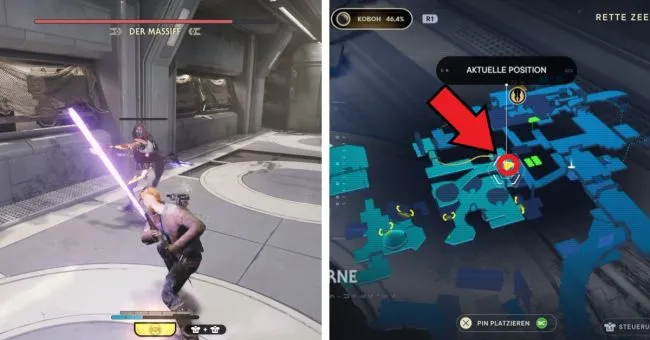Для этого перейдите к точке медитации "Лукрекерн" и бегите по пандусу налево к юрте-бараку, где войдите в дверь и сразу же поверните направо. Пробегите здесь дальше, поверните налево сзади, поднимитесь по стойкам, повернитесь и откройте Силой дверь перед собой. Тройной прыжок на другую сторону, где вы встретите Массифа, своего рода прыткого Магна-гвардейца.