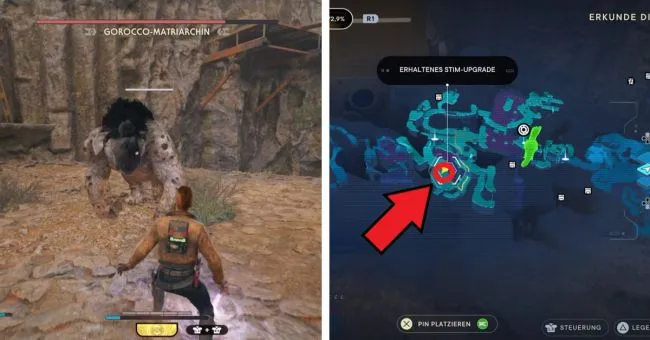 Теперь следуйте по этому пути, по пути уничтожьте Горокко и дроздов и подтянитесь по канату сзади. Здесь бегите по левой стороне, стреляйте в катящиеся мины и дроидов и, наконец, поднимите желтую металлическую стену слева с электричеством. Пробейтесь через нее и перепрыгните на плато, где встретите матриарха Горокко. Здесь же Вы найдете еще один контейнер со стимом.