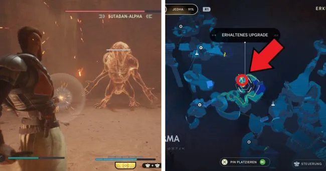Для того чтобы попасть на Сутабан Альфа, необходим талисман Меррина, позволяющий проходить сквозь зеленые лазерные барьеры. Талисман Меррина вы получите в главе 4 во время побега из Храма джедаев. Получив талисман Меррина, отправляйтесь в гробницу Урмы. В гробницу Урмы можно попасть, пройдя основной сюжет и решив головоломки ветра в третьей главе, о которых мы рассказываем в нашем прохождении.