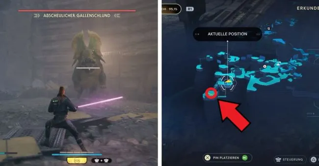 Начните с точки медитации "Заброшенная плотина", пробегите вдоль скальной стены справа и уничтожьте здесь врагов. Затем позвольте одной из катящихся мин, появляющихся в пещере слева, следовать за вами и бегите направо, пока не достигнете уступа сзади. Здесь вы можете поднять ее с помощью Силы и бросить мину в мерцающую маслянистую стену перед вами, чтобы взорвать ее и открыть проход.