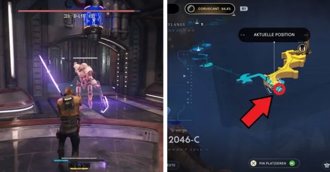 Когда вы прибудете на Корусант, вы уже будете находиться в ангаре. Пробегите в заднюю часть, уничтожьте по пути штурмовиков и войдите в дверь сзади слева, где находится точка медитации "Ангар 2046-C". Поднимитесь на лифте вверх и найдите слева большую дверь. Над ней вы увидите источник энергии, который BD-1 активирует своей электрической стрелой. Дверь откроется, и из нее выскочит улучшенный дроид-охранник D-L1T.
