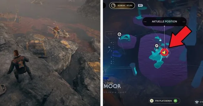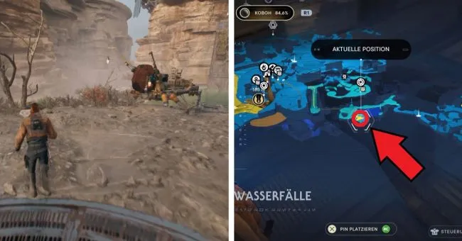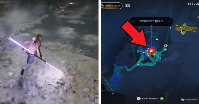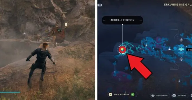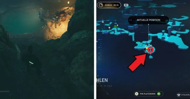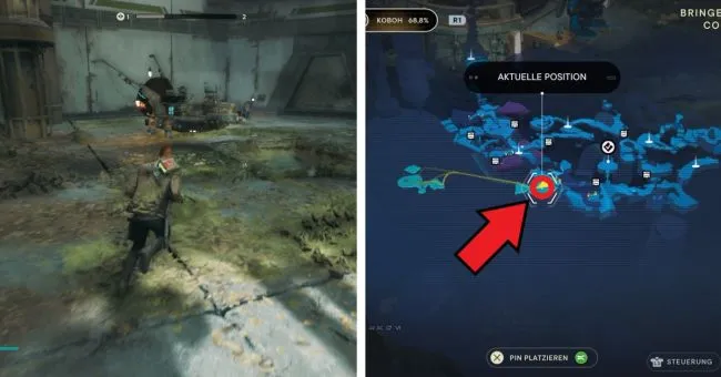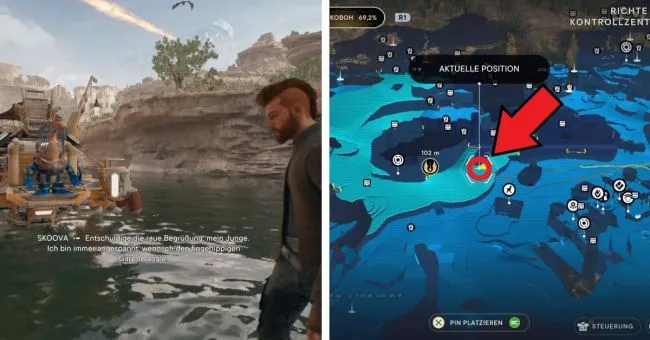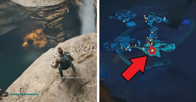 Начните с точки медитации "Bergaufstieg". Здесь вы сначала пробежите через два зеленых лазерных барьера справа, а затем расправитесь с имперцами на мосту слева. Затем спрыгните вниз на уровень справа под вами, где также можно увидеть водопад. За водопадом находится вход в Палату отряда. Слева у края вы увидите ялик Сковы.