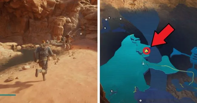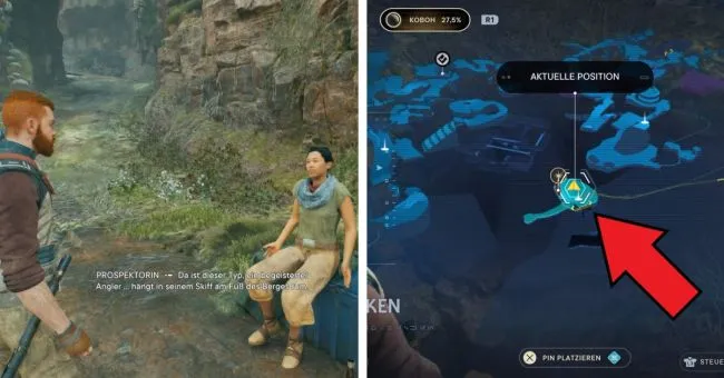 Найти рыбу-змею можно, доехав до точки медитации "База Анахоретов" и повернув здесь направо. На возвышенном плато вы быстро найдете водоем, где Скова уже готовится ловить рыбу.