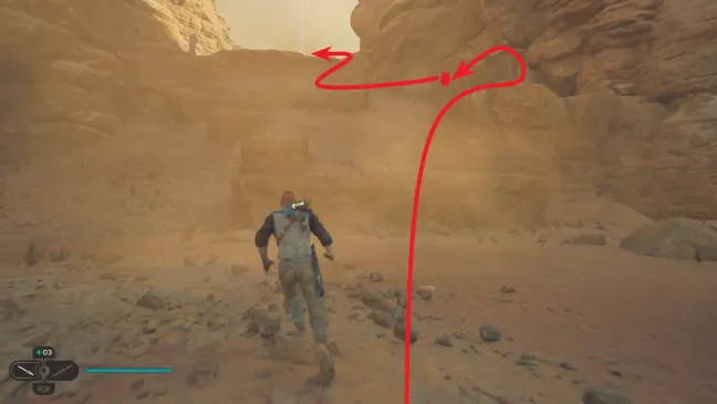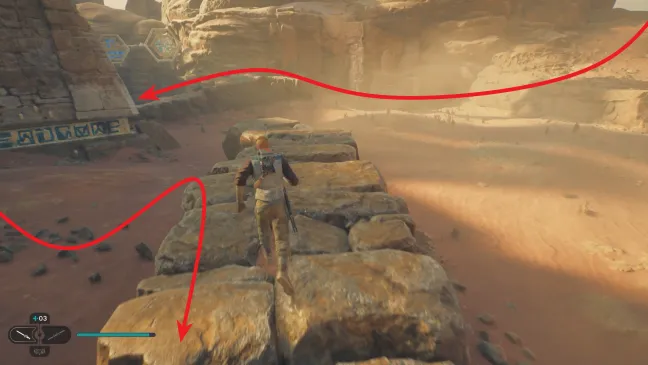 Чтобы попасть на скользкий склон после приземления, нужно встать лицом к скалам справа. Здесь вы найдете несколько твердых ракушек (насекомоподобных монстров), а также узкое место, где можно поочередно прыгать на две противоположные скальные стены, чтобы ухватиться за выступ наверху, взобраться по нему, а затем перепрыгнуть на бороздчатую стену и выполнить там настенный бег. Отсюда спрыгните на плато, откройте здесь короткий путь и бегите дальше к точке медитации "Монастырские стены".